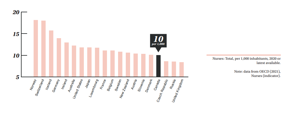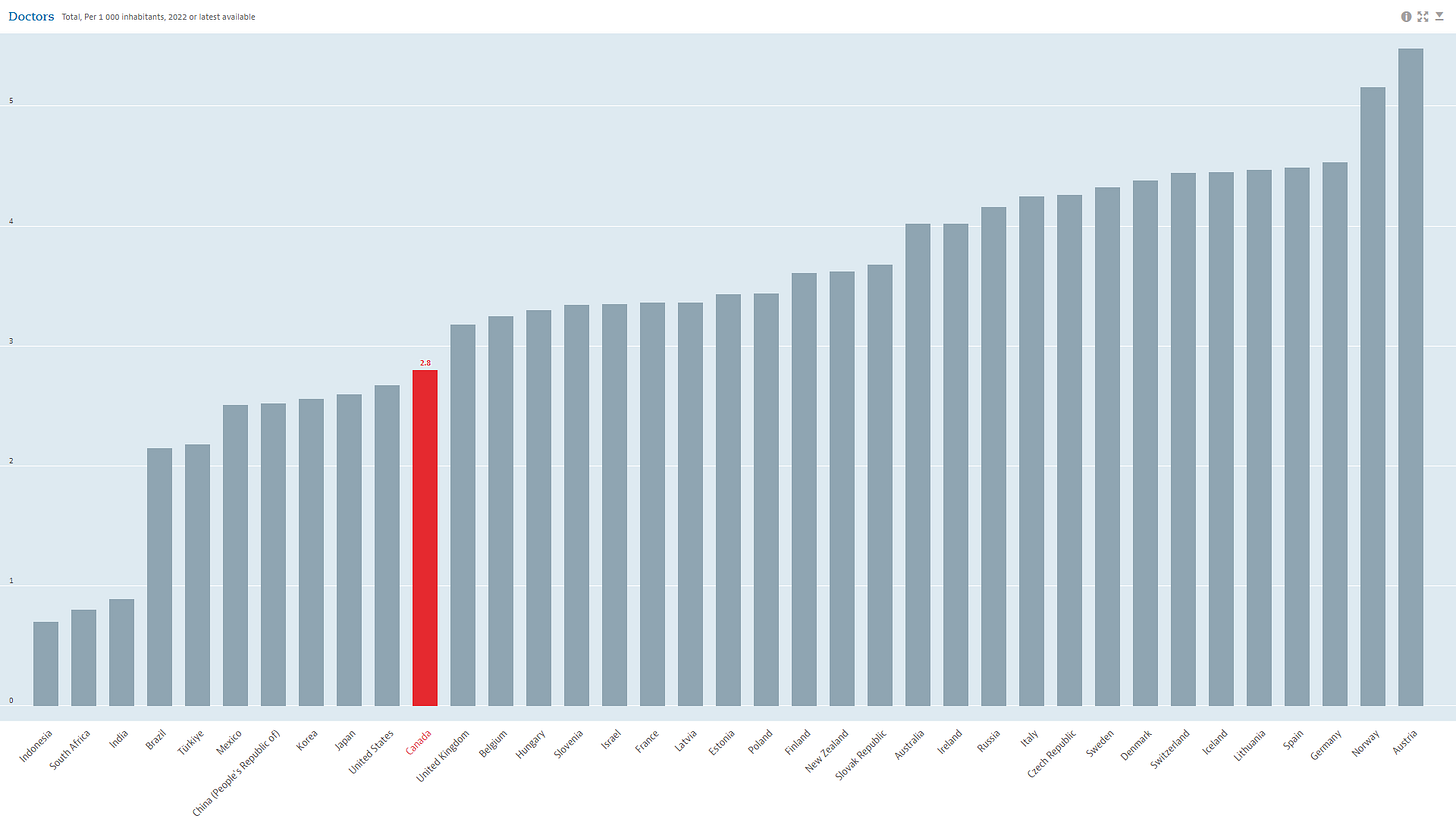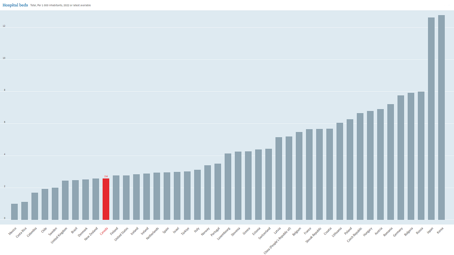 As it is, Canada is lagging behind its peers in medical care with 2.8 doctors per 1,000 people (2022), just under 10 nurses per 1,000 people and the number of beds per 1,000 people has been dropping for years to 2.6.