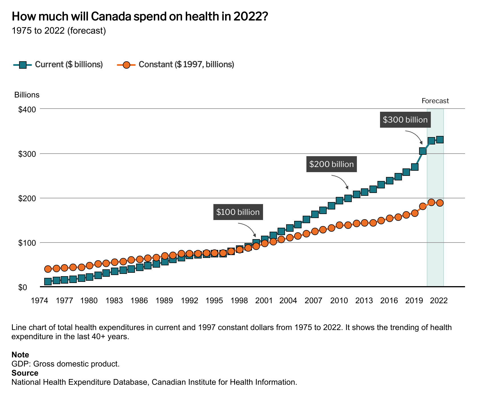 Canada spends roughly $330B a year (2022) on healthcare. Canada Health Transfers are $49.1B this fiscal year and will grow based on the new funding arrangement. Around $8,500 per person (2022). 12.2% of gross GDP in 2022. Yet there is no clear picture of what is going on, where, or why.