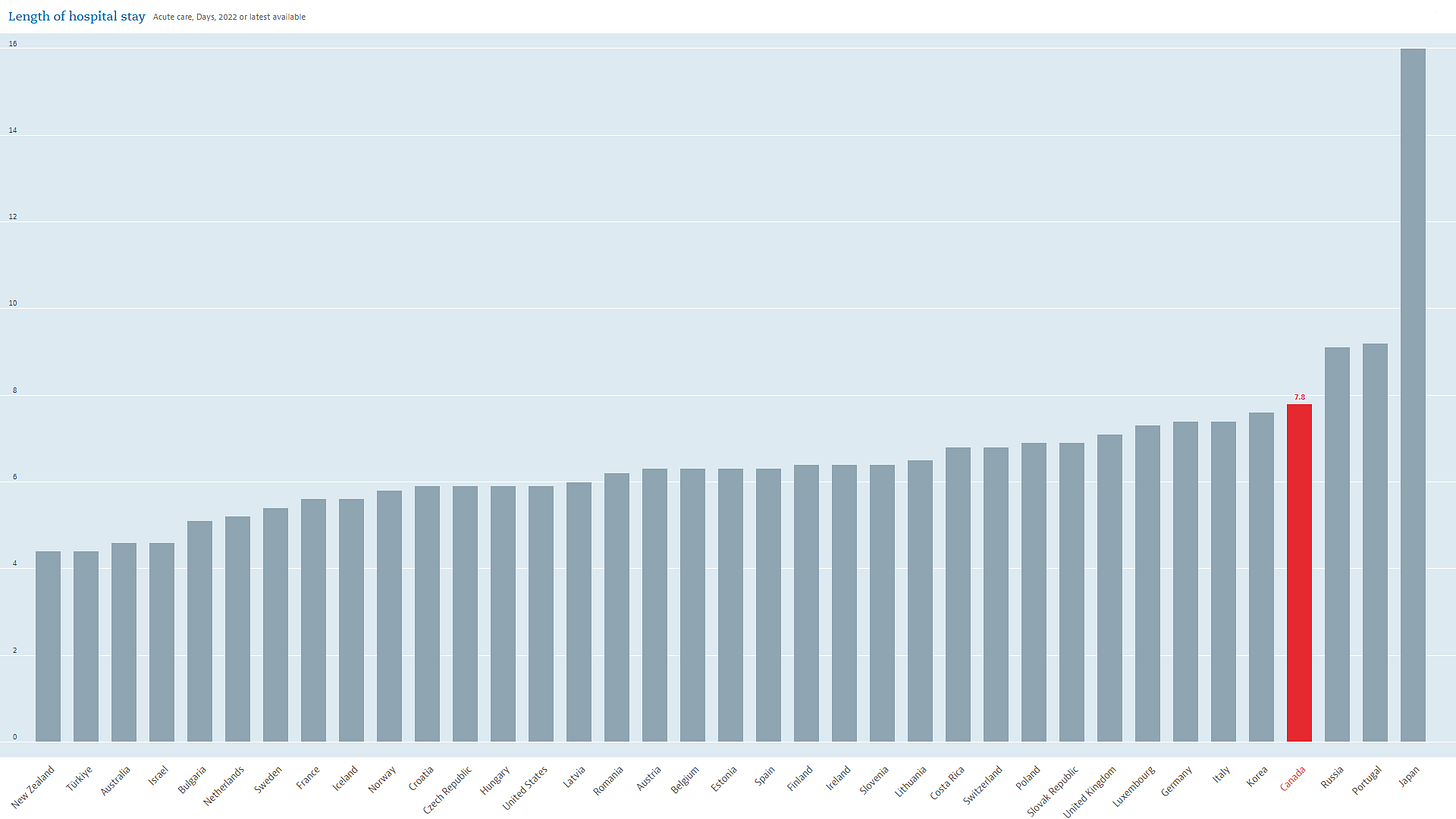 This lack of preparedness and long-term thinking is one of the biggest issues as to why so many Canadians can’t get care and why the wait times are so long. At the same time while not having enough facilities and staff the length of stay in hospitals in Canada is at the high end compared to peers.