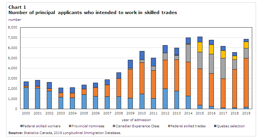 The number of registrations and certifications in apprenticeship, and Red Seals all peaked in the early to mid-2010s. Skilled trade immigration has not been enough to fulfill demand but it should be a focus, as skilled trade immigrant men have the highest employment probability among economic migrants with an employment incidence of over 90% going back over 20 years of data.