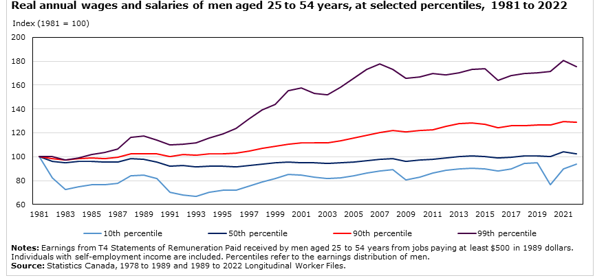 The earnings of core-aged men in Canada over the past 40 years highlight what should be an alarm and complications. The bottom 10% of earners make less than the bottom 10% did 40 years ago, while living in a much more expensive world. The 50th percentile has barely seen an increase in real wages in 40 years. Any progress the middle class had has been swallowed by inflation.