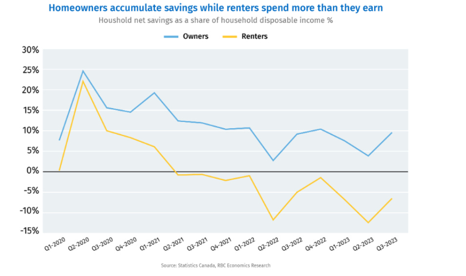 This puts renters in the worst financial position as a demographic, on average, in Canada. Credit card and auto loan payments arrears are growing faster in renters. This means a bigger and growing percentage of Canadians have the inability to grow wealth and have declining or negative saving rates.