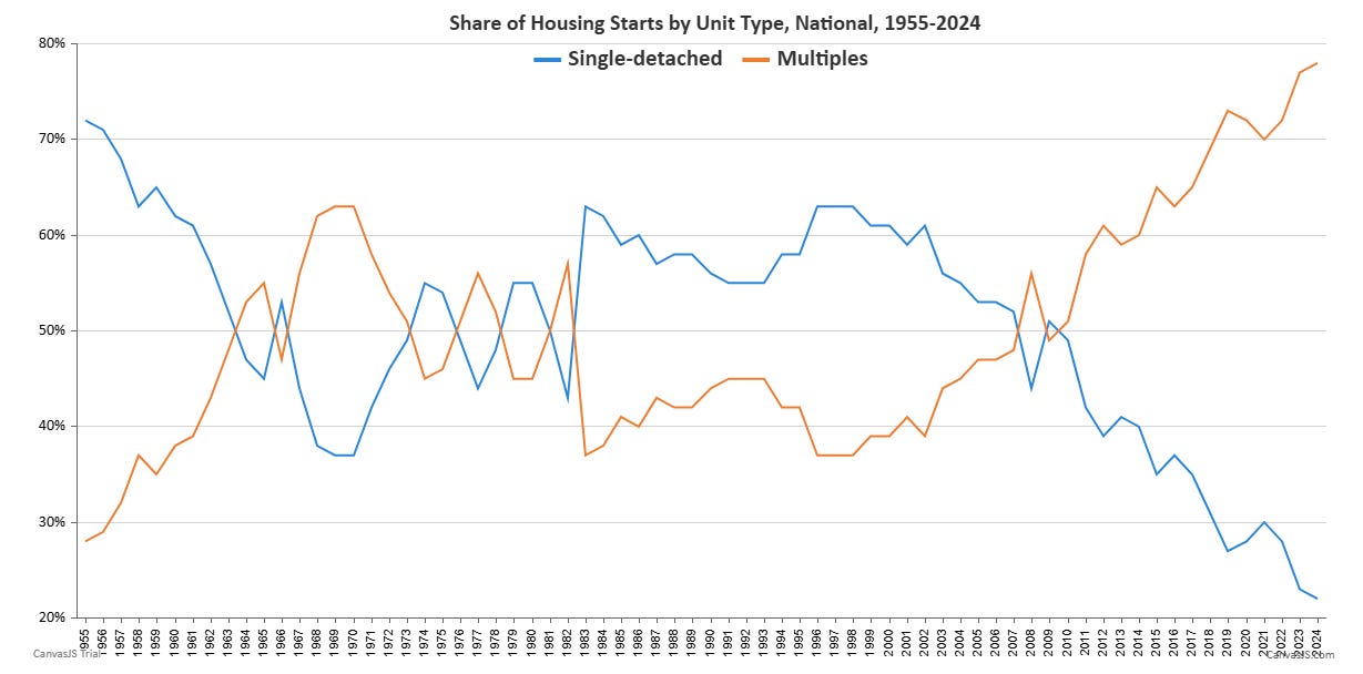 The other big hurdle facing renters in entering homeownership that isn’t talked about is home choices. Over the last couple of decades, dwelling construction has moved definitively from single-detached to multi-unit.