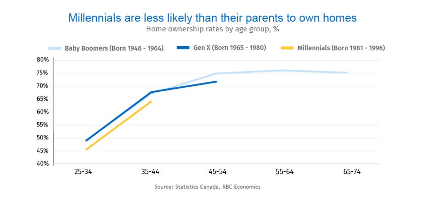 Often, multi-unit dwellings such as condos or townhouses come with condo fees, and that additional hard cost shrinks how much in mortgage people can take on. This leads to further erosion of homeownership affordability and when Canadians can actually afford a home it is a much less of a home than any generation beforehand.