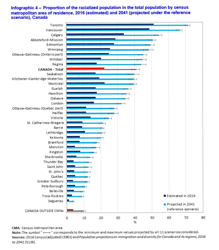 From 2016 to 2041 the average growth rate of racialized (what the government refers to as those who are not white) population would be between 2.9% and 4.2% compared to the Canadian population of 0.7% and 1.5%.