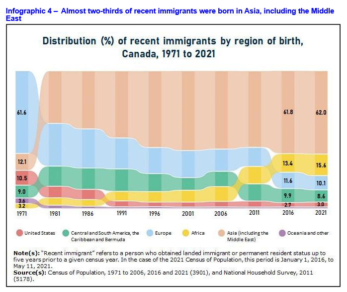Over the last few decades, the majority of immigration into Canada originated from Europe and over time it transitioned to Asia, Middle East, and Africa as the source.