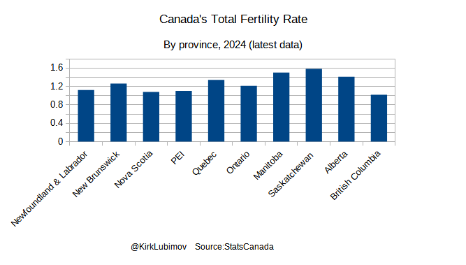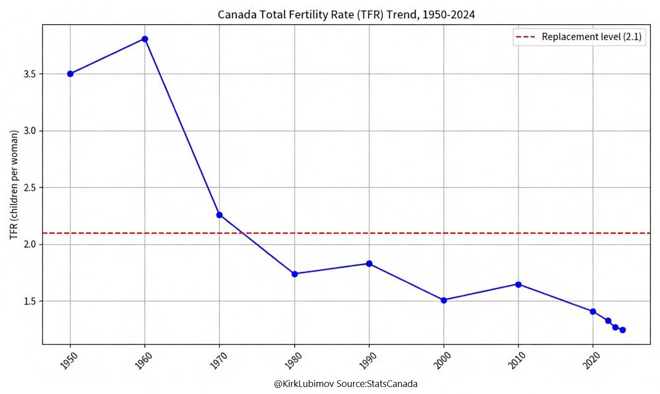 Canada has joined the ultra-low fertility classification status. It is a classification given when a country declines below a total fertility rate (TFR) of 1.25. It has been dropping for decades, and is lower than our replacement rate of 2.1.