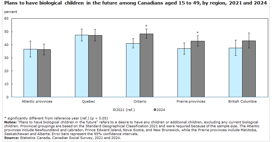 According to research by Statistics Canada and the Canadian Social Survey, more young people want to have kids now than in years before. The only slight declines are in Atlantic Provinces and in Quebec.